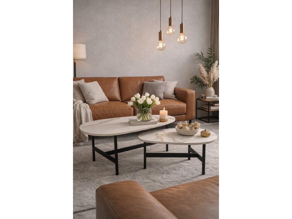 Elegantní a moderní sada konferenčních stolků představuje ideální spojení designu, funkčnosti a odolnosti. Luxusní deska ze slinutého křemene Calacatta Gold o tloušťce 12 mm dodává stolkům výjimečný, nadčasový charakter a skvěle se hodí jak do moderních, tak i klasických interiérů.