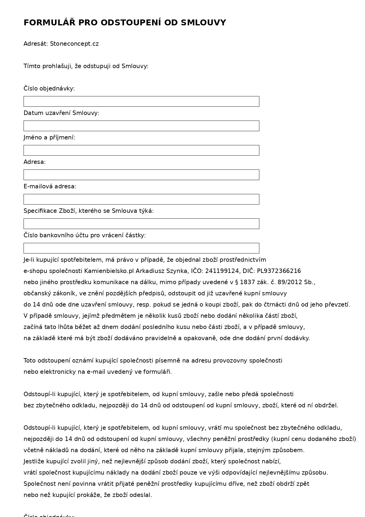 Pokud jste spotřebitel (nikoliv podnikatel), máte podle § 1829 odst. 1 občanského zákoníku právo odstoupit od kupní smlouvy uzavřené prostřednictvím e-shopu www.stoneconcept.cz bez udání důvodu do 14 dnů ode dne převzetí zboží.